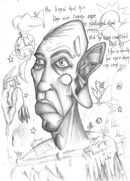 He has stripped off work clothes to reveal a fitted T-shirt with an unusual drawing, a portrait of a rather concerned looking chap. Entitled, “Awareness of Life,” it bears this inscription: “He knew that his time was coming once he swallowed that penny….. But he then realized that his life is worth far more than one cent.”